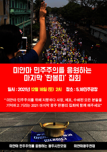 [기사]”새해엔 미얀마에 평화를”..올해 광주서 마지막 ‘딴봉띠’ 집회 / 한겨레 / 21.12.17. https://news.v.daum.net/v/20211217112604779