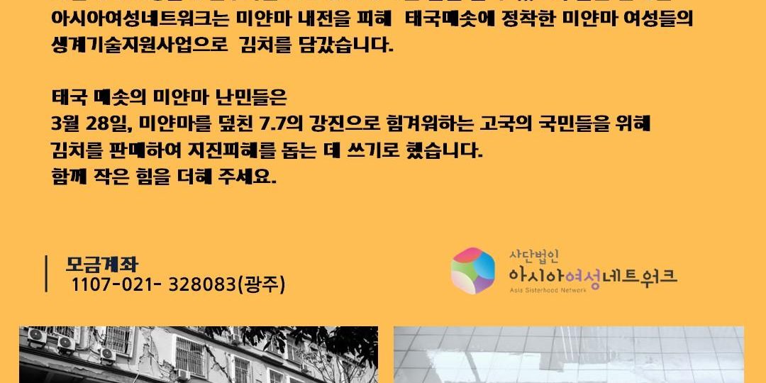 미얀마 만달레이에서 발생한 7.7의 강진 피해자들의 긴급생계지원을 위해