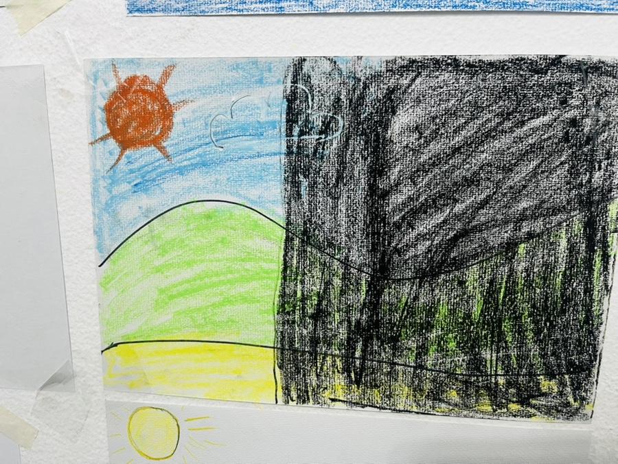 E : 집, 안전한 장소를 떠올릴 수 있는 곳을 그리라고 하는데 그때 많이 울고 ‘인생의 강’을 그릴 때는 검은색 등 강한 색을 쓰지 않고 다양한 색을 쓰는 변화를 느낄 수 있어요. ‘인생의 강’ 같은 그림을 그리는 이유는 집중력이 좋아지게 하고 어떤 색깔을 쓸지, 예쁘게 표현할 수 있도록 독려하기도 하고요.