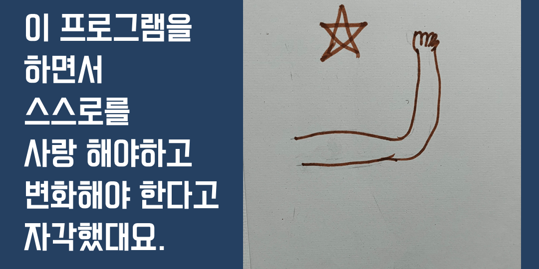 이 그림의 경우 집단상담을 하기 전에는 세 번이나 자살시도를 했고, 초반기에는 자살을 하고 싶어 하거나 자살과 관련한 말을 많이 했는데 이 프로그램을 하면서 자신이 스스로를 사랑해야 하고 변화를 만들어야 한다는 것을 자각하게 되었다고 합니다.