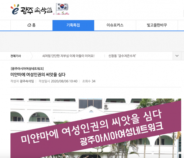 [보도자료]“미얀마, 민주주의를 위한 저항의 1년” 사진 전시회 (사)아시아여성네트워크(전 광주아시아여성네트워크)는 5월 13일부터 6월 30일까지 5ㆍ18민주광장에서 “미얀마, 민주주의를 위한 저항의 1년” 이라는 주제로 상설 사진 전시회를 개최한다. 사진 전시는 MPA가 선정한 2021년의 대표 사진, 시민불복종운동인 CDM (Civil Disobedience Movement)에 참여한 시민들, 정글로 들어가 총을 든 청년과 여성들의 저항, 군대의 공격으로 불타버린 마을들과 숲속에서 고달픈 피난 생활을 하고…